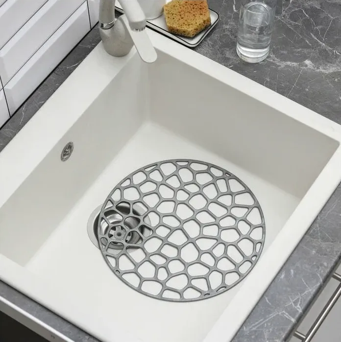 Коврик для раковины изготовлен из пластика. Изделие одновременно выполняет несколько функций: украшает, предотвращает появление на раковине царапин и сколов, защищает посуду от повреждений при падении в раковину, удерживает мусор, попадание которого в слив приводит к засорам. Изделие также обладает противоскользящим эффектом и может использоваться в качестве подставки для сушки чистой посуды. Легко очищается от грязи и жира.