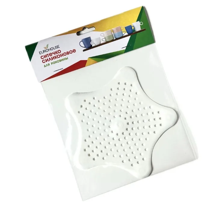 Ситечко для раковины Eurohouse предотвращает засорение труб на кухне и в ванной комнате. Задерживает пищевой мусор, волосы. Легко крепится на поверхности благодаря специальным присоскам.
